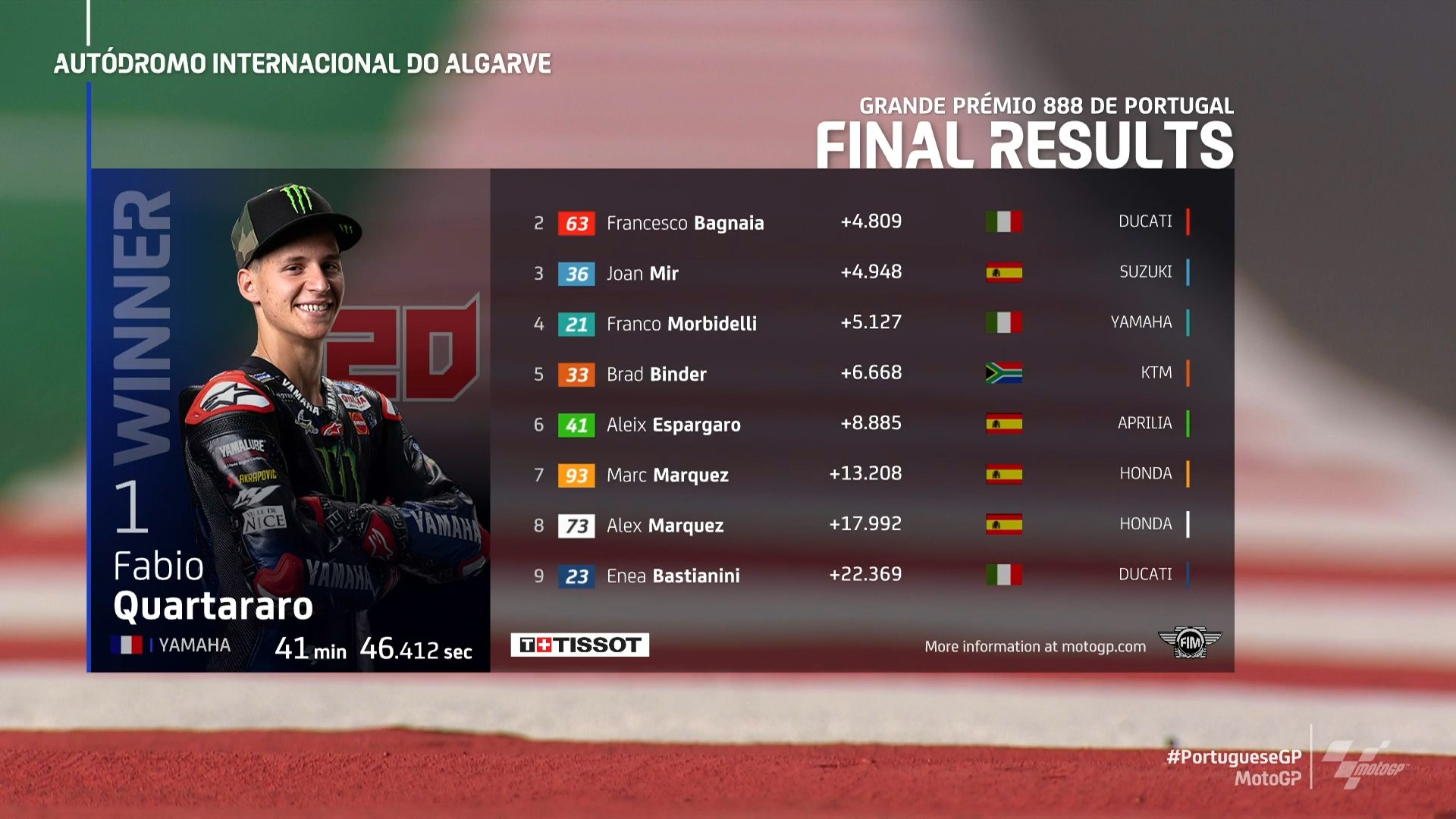 Motogp On Twitter Fabioq20 Extends Yamahamotogp S Winning Start Peccobagnaia Takes Second While Joanmirofficial Takes The First Podium Of His Title Defence Portuguesegp Https T Co Uzjdx45d3a Twitter